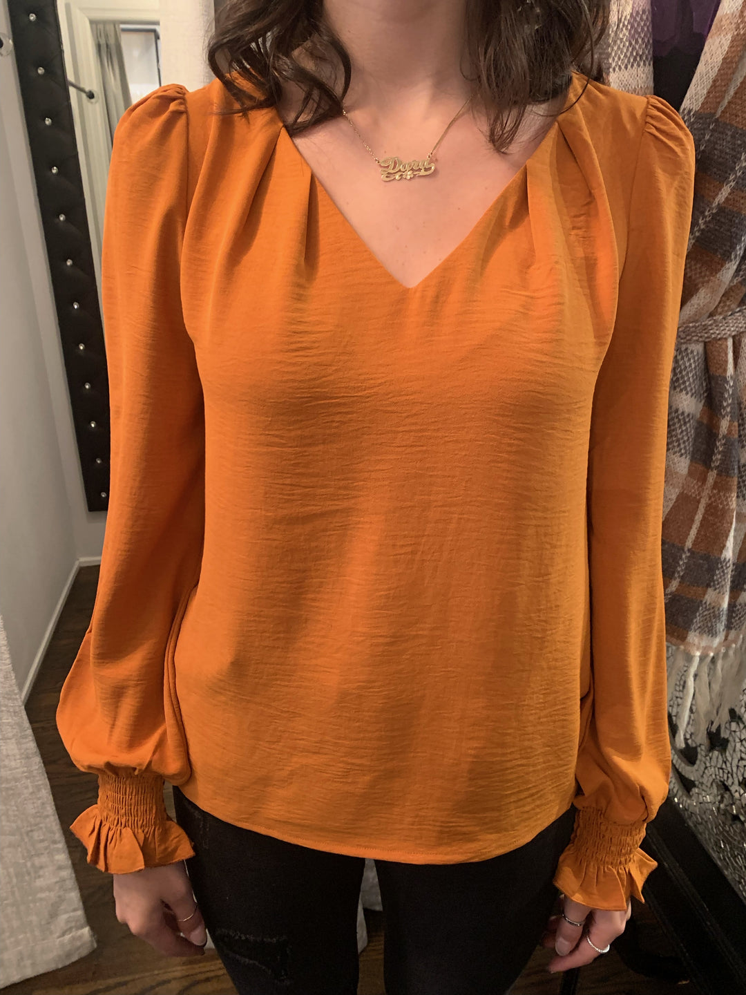 Rust V neck Blouse with Ruched Sleeve