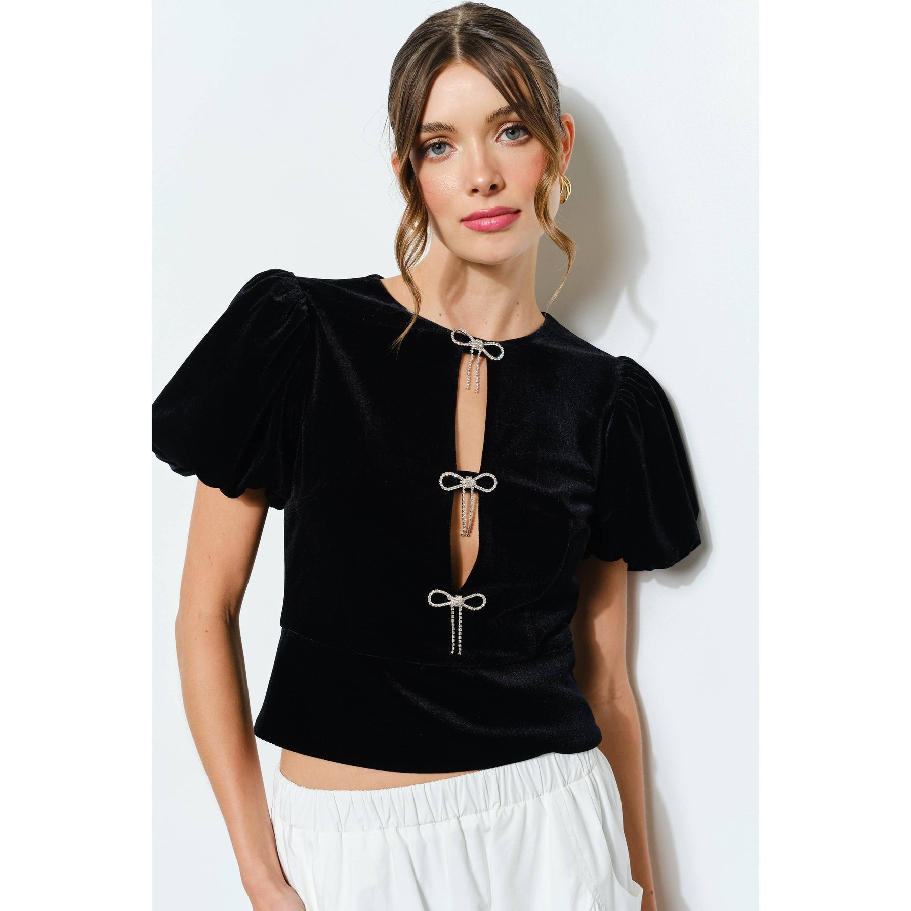 Rhinestone Bow Cutout Velvet Puff Sleeve Top