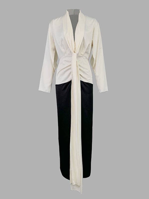 #Long Sleeves, #Loose Fit, #Contrast Color, #V-neck Dress, #Evening Wear, #Maxi Dress, #Dacron Fabric, #Casual Style, #Vacation Outfit, #Seasonal Dress